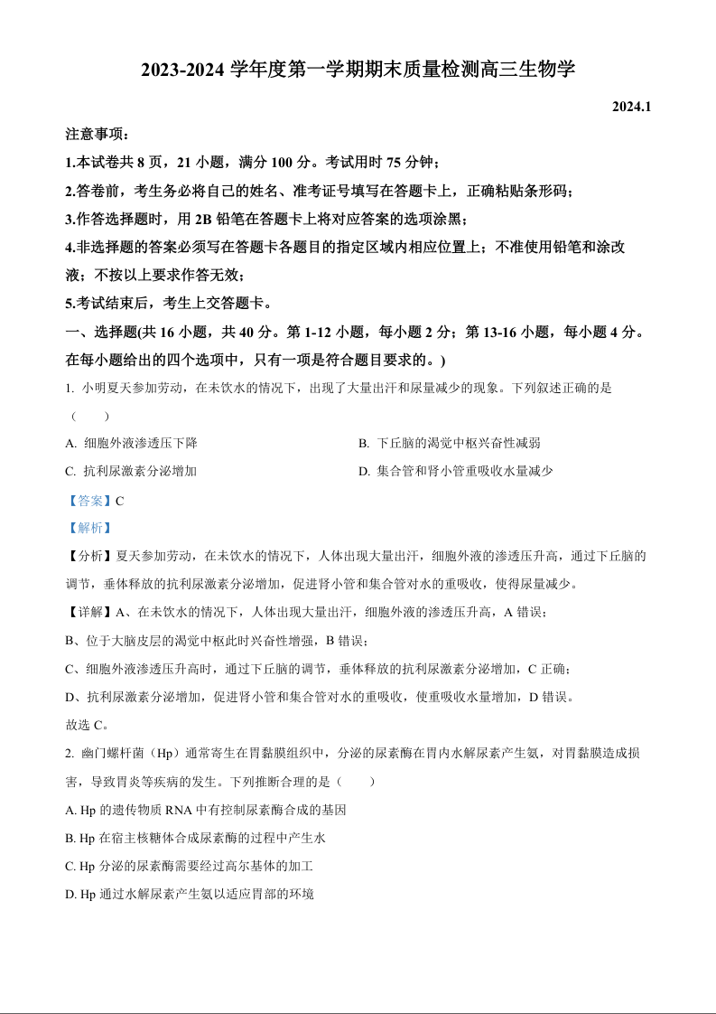 广东省深圳市罗湖区2024届高三上学期期末质量监测生物(精品解析版)