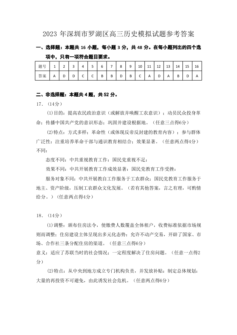 广东省深圳市罗湖区2024届高三上学期期末质量监测历史答案