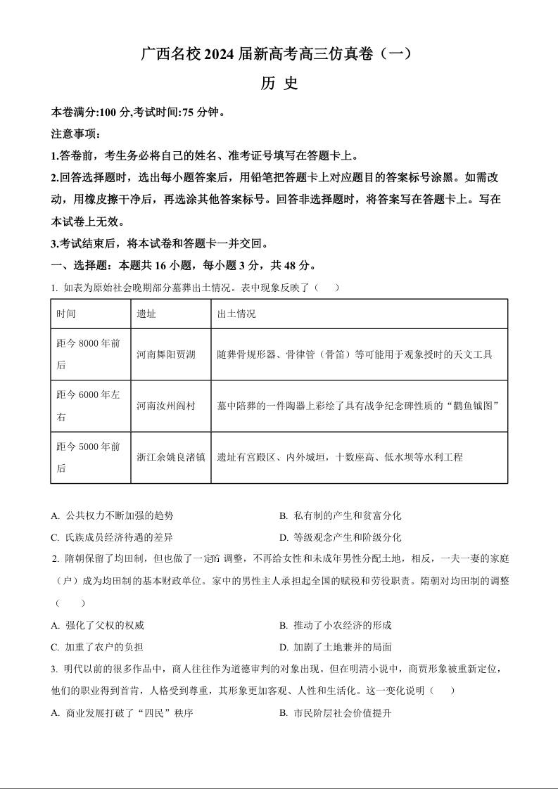 广西名校2024届高三上学期新高考仿真卷(一)历史+答案