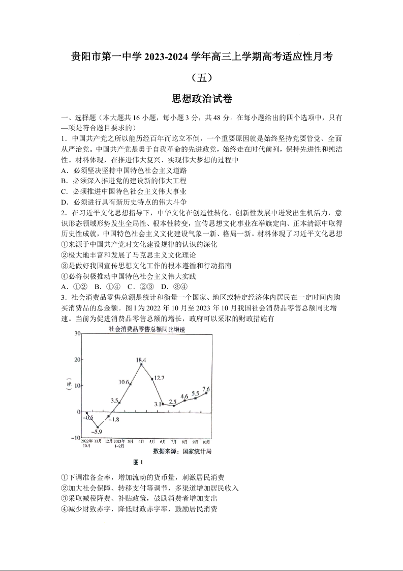 贵州省贵阳市第一中学2024届高三上学期适应性月考(五)政治+答案