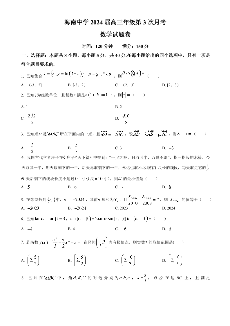 海南省海南中学2024届高三上学期第三次月考数学+答案