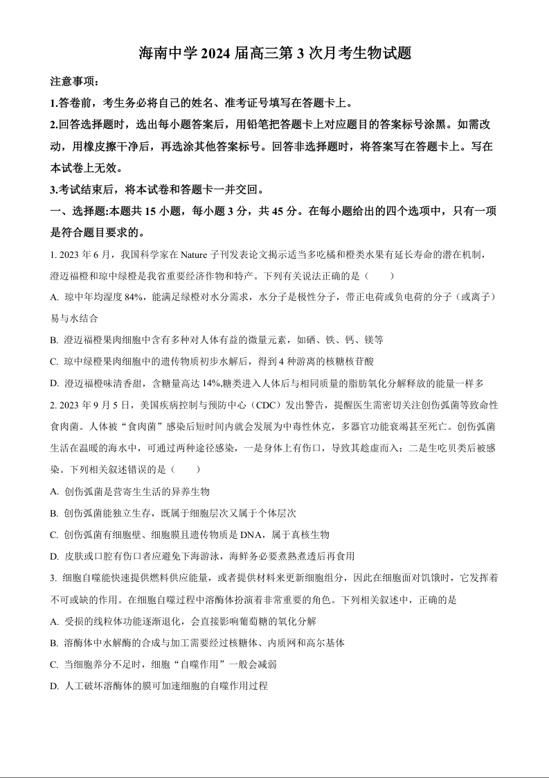 海南省海南中学2024届高三上学期第三次月考生物+答案