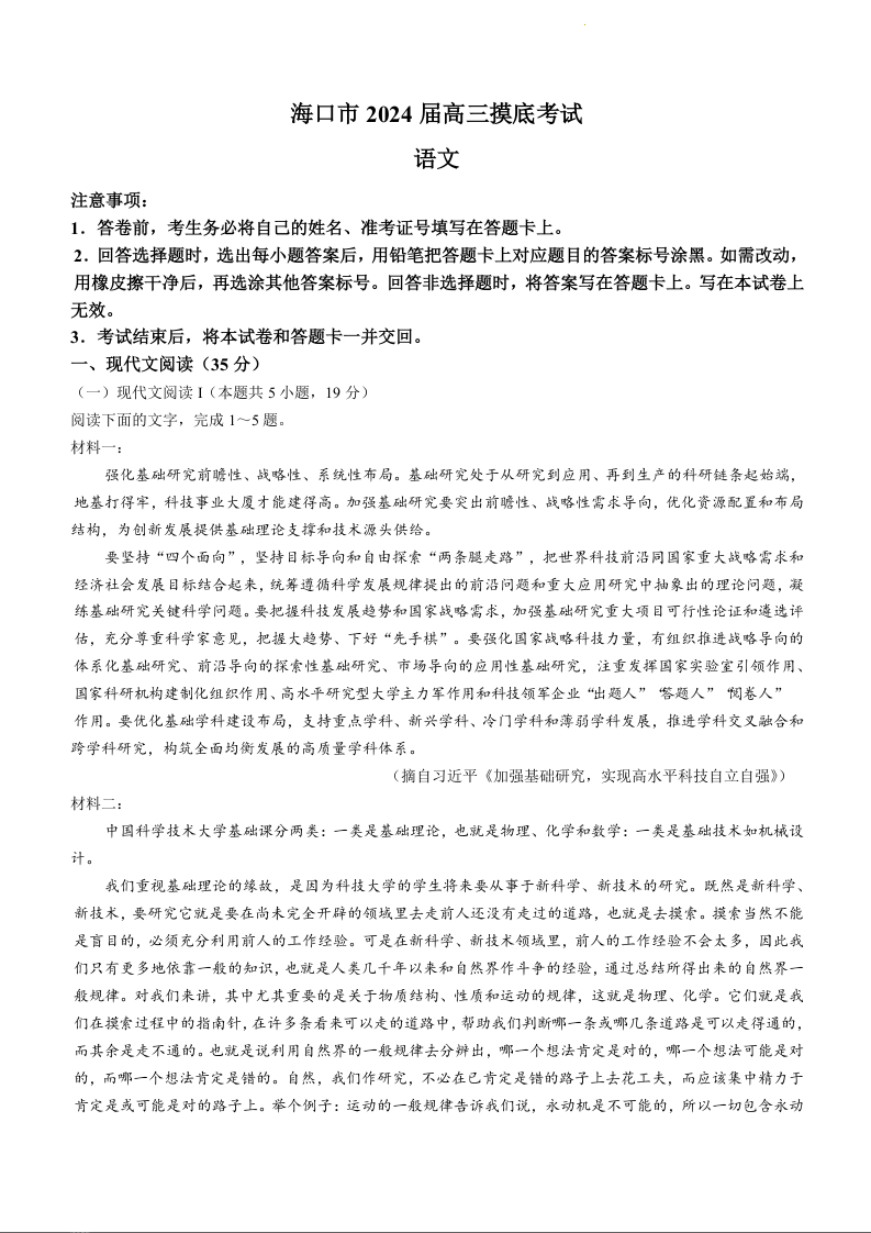 海南省海口市2024届高三上学期1月摸底考试(海口一模)语文