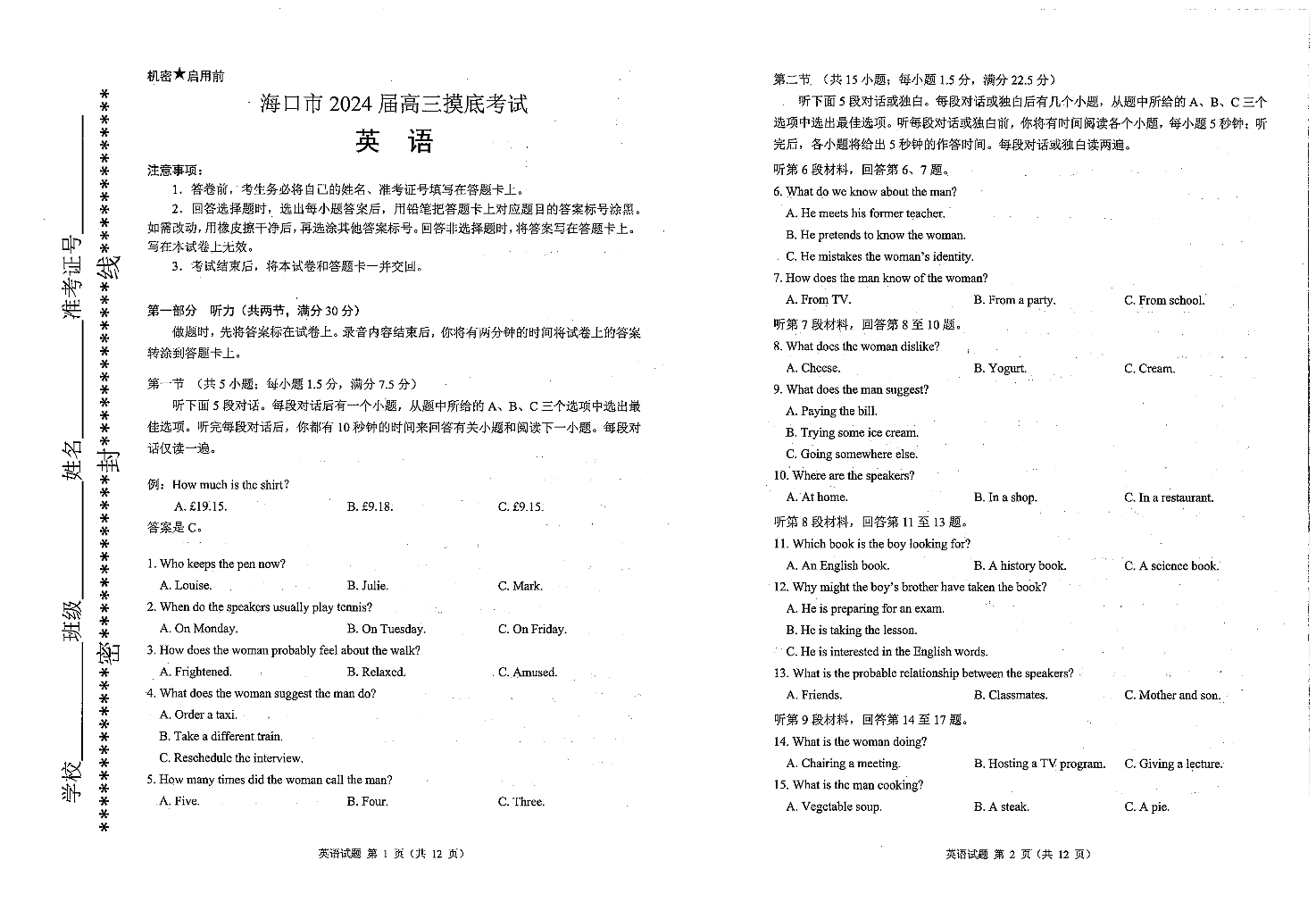 海南省海口市2024届高三上学期1月摸底考试(海口一模)英语
