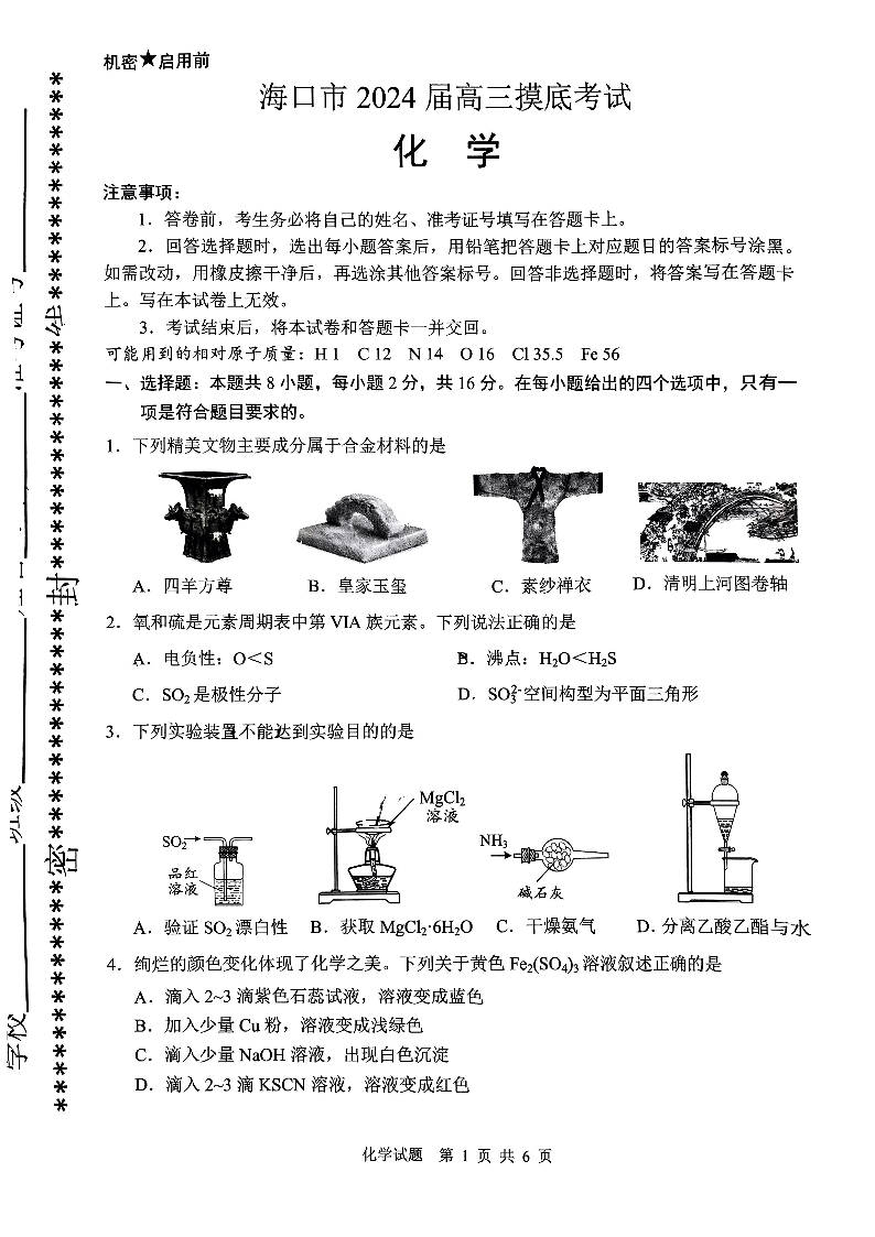 海南省海口市2024届高三上学期1月摸底考试(海口一模)化学