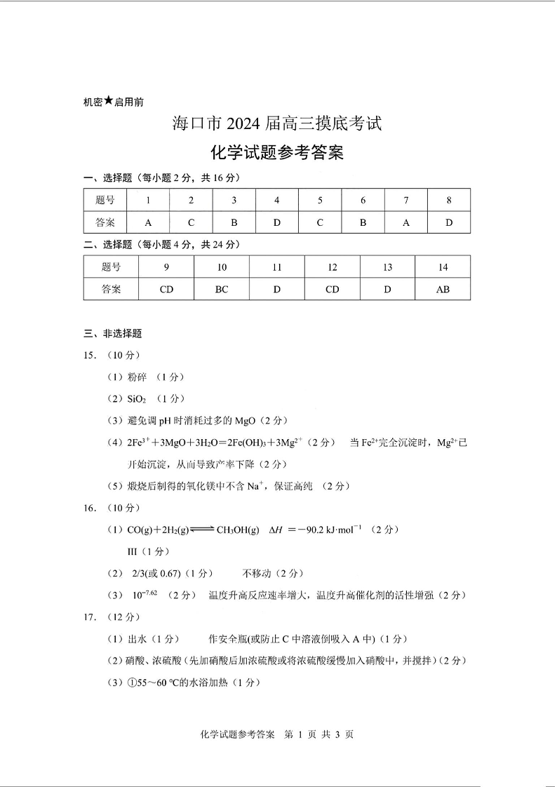 海南省海口市2024届高三上学期1月摸底考试(海口一模)化学答案