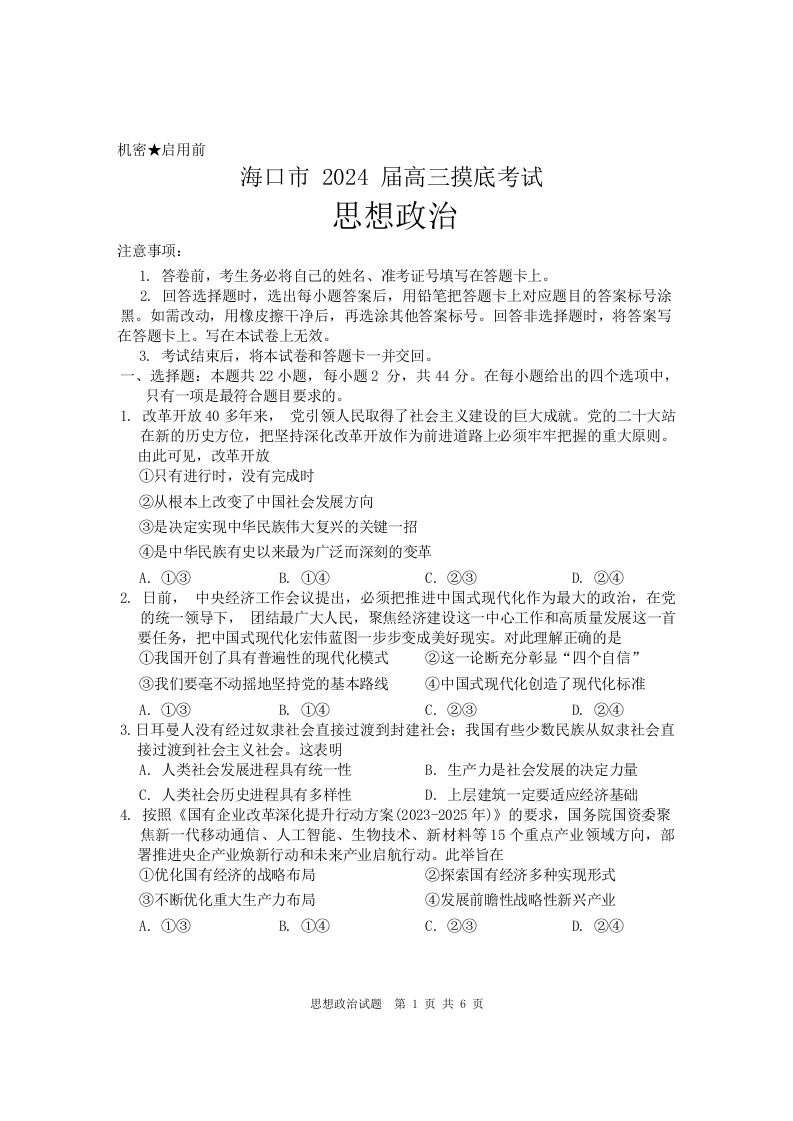 海南省海口市2024届高三上学期1月摸底考试(海口一模)政治
