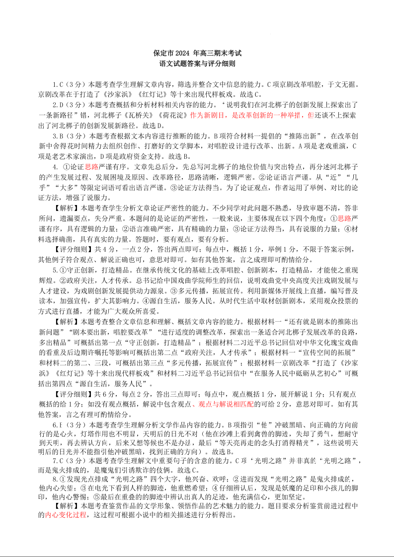 河北省保定市2024届高三上学期期末调研考试语文答案