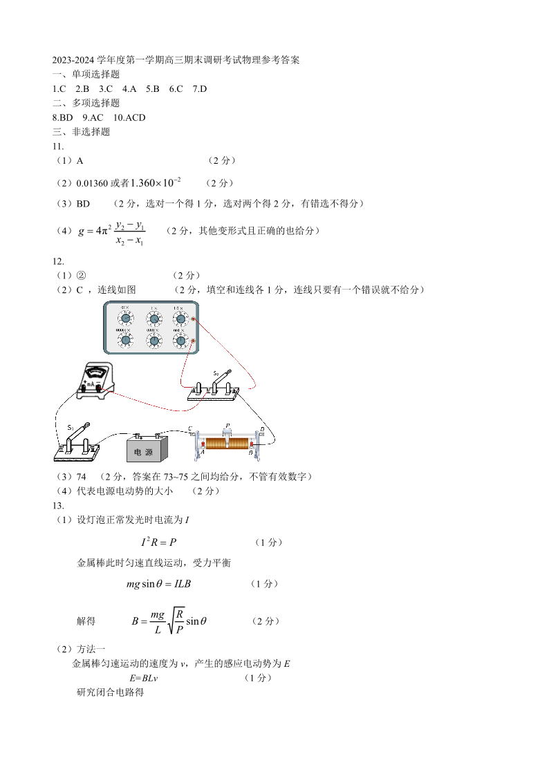 河北省保定市2024届高三上学期期末调研考试物理答案