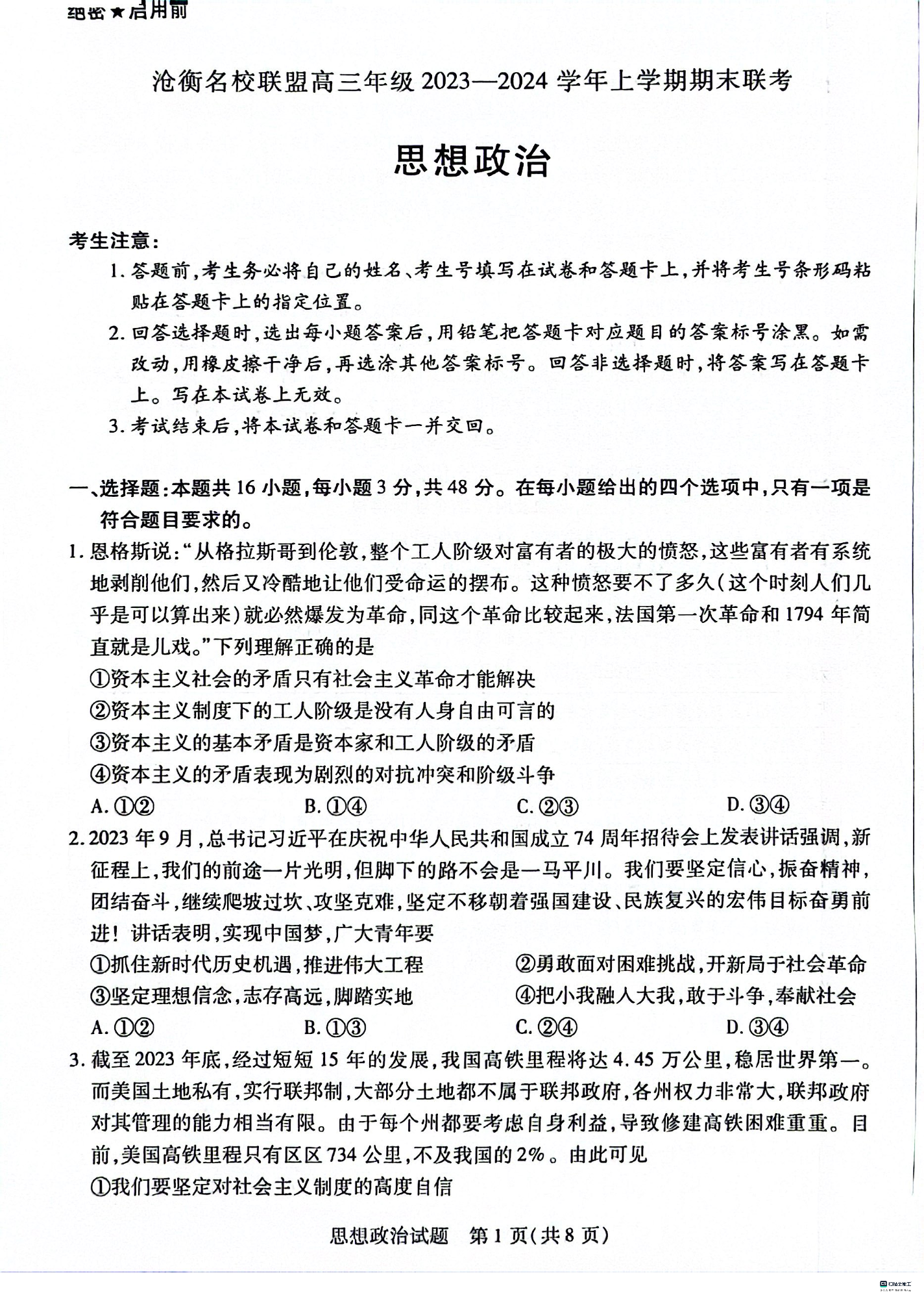 河北省沧州市联考2024届高三上学期1月期末考试政治+答案