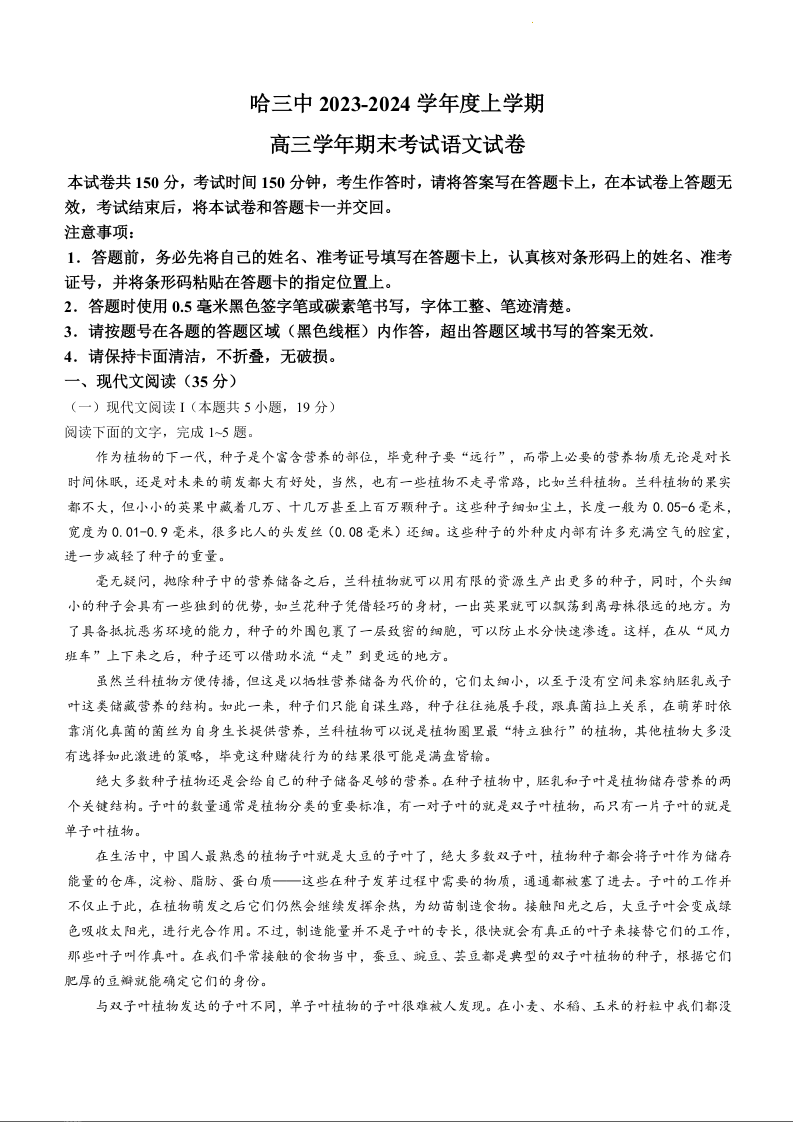 黑龙江省哈尔滨市第三中学校2024届高三上学期1月期末语文