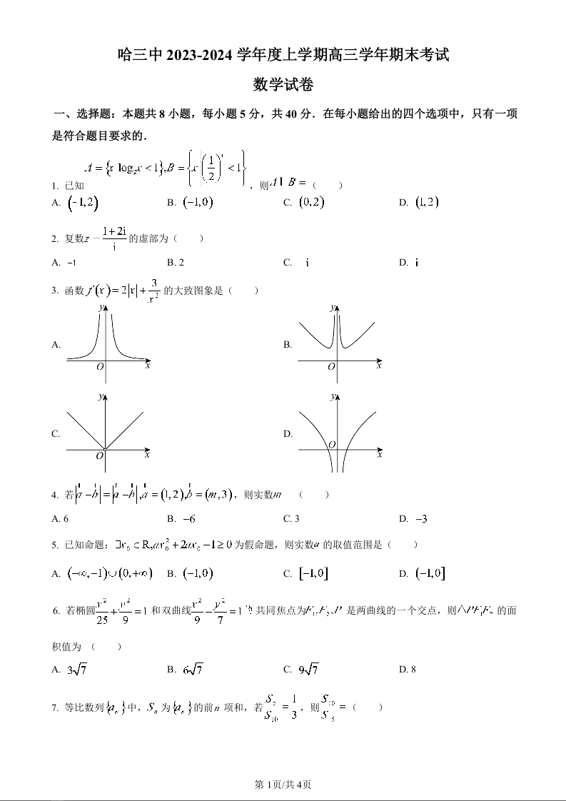黑龙江省哈尔滨市第三中学校2024届高三上学期1月期末数学(原卷版)