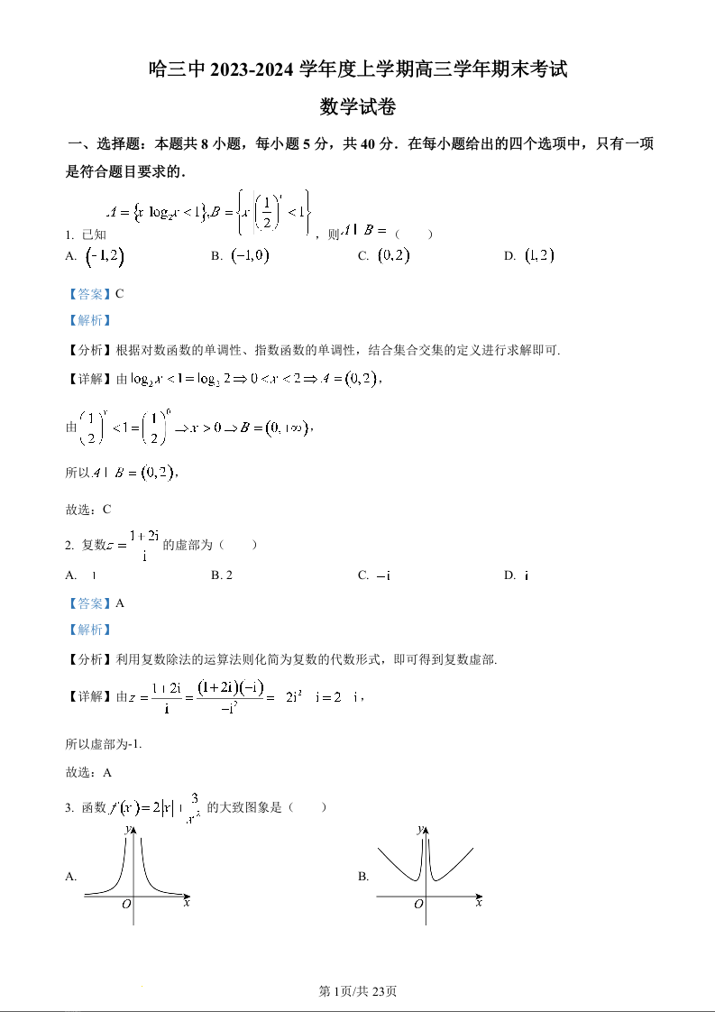 黑龙江省哈尔滨市第三中学校2024届高三上学期1月期末数学(精品解析版)