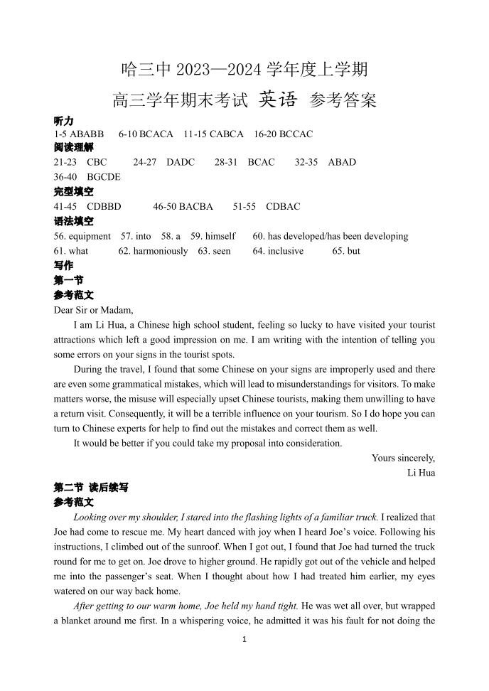 黑龙江省哈尔滨市第三中学校2024届高三上学期1月期末英语答案