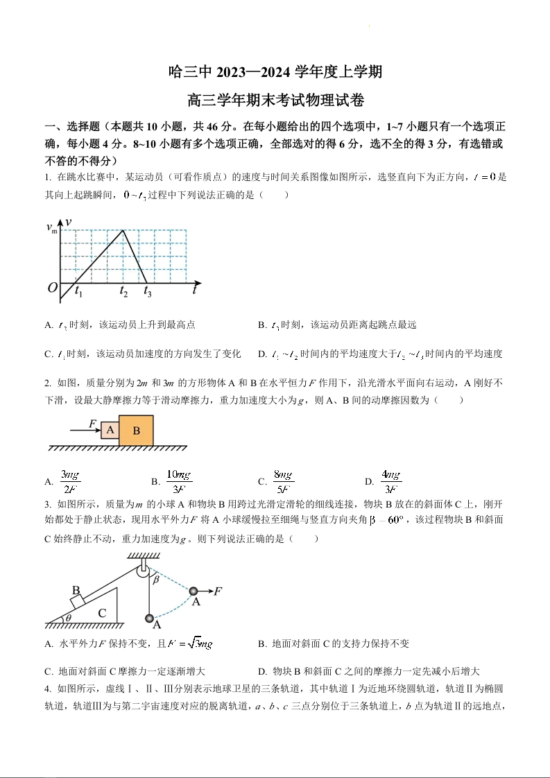 黑龙江省哈尔滨市第三中学校2024届高三上学期1月期末物理