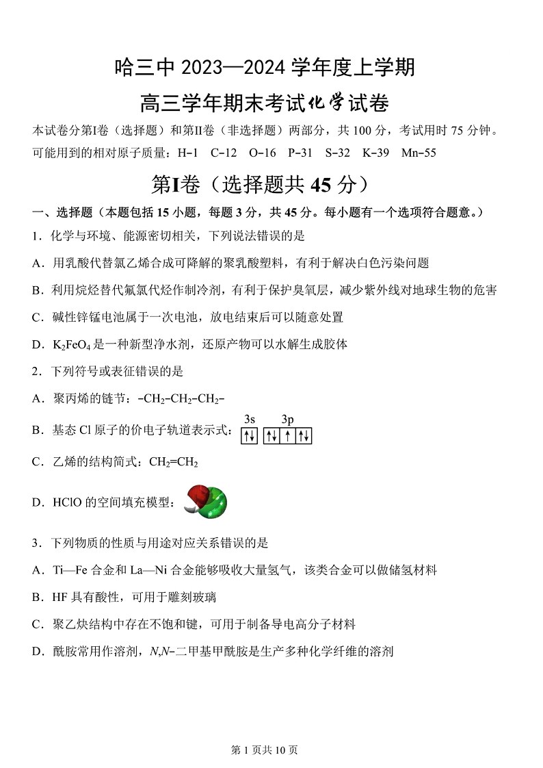 黑龙江省哈尔滨市第三中学校2024届高三上学期1月期末化学
