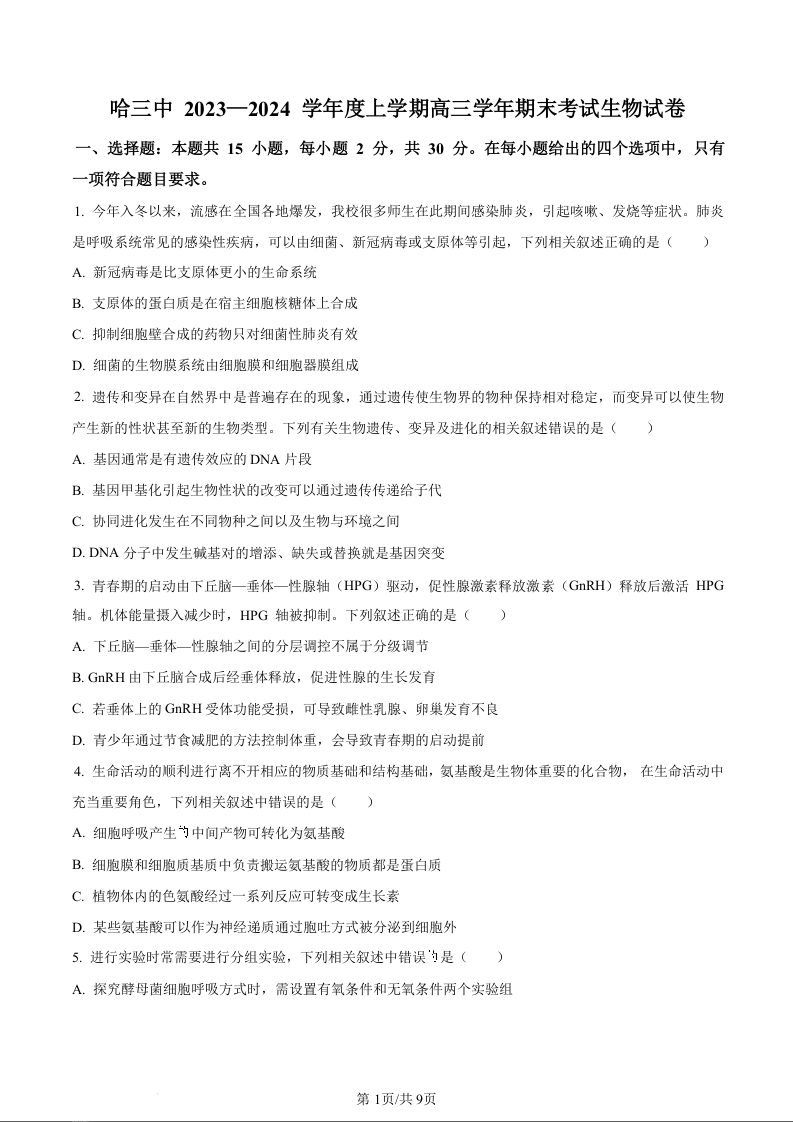 黑龙江省哈尔滨市第三中学校2024届高三上学期1月期末生物(原卷版)