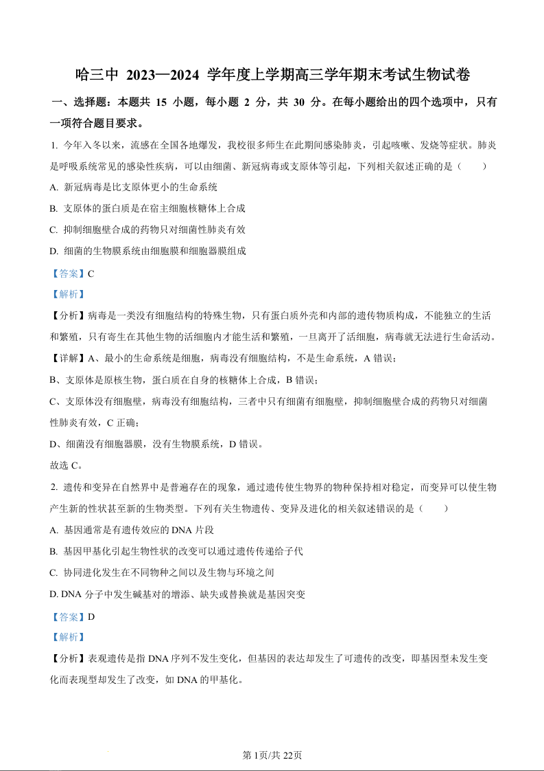 黑龙江省哈尔滨市第三中学校2024届高三上学期1月期末生物(精品解析版)