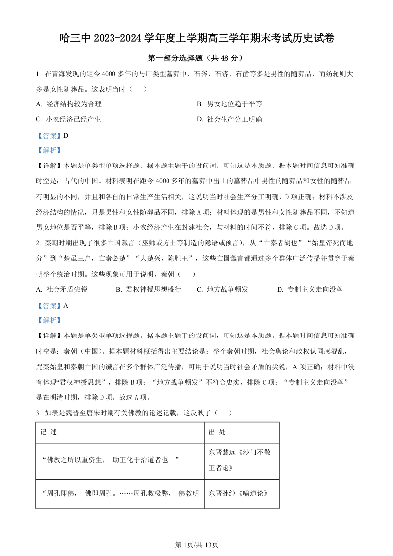 黑龙江省哈尔滨市第三中学校2024届高三上学期1月期末历史(精品解析版)