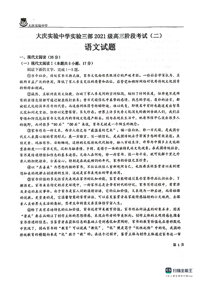 黑龙江省大庆市实验中学实验三部2024届高三上学期阶段考试(二)语文