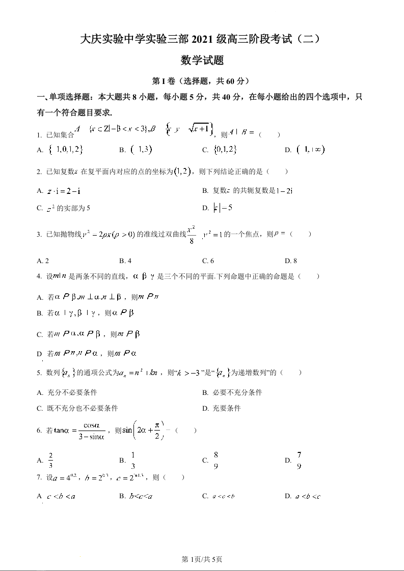黑龙江省大庆市实验中学实验三部2024届高三上学期阶段考试(二)数学(原卷版)