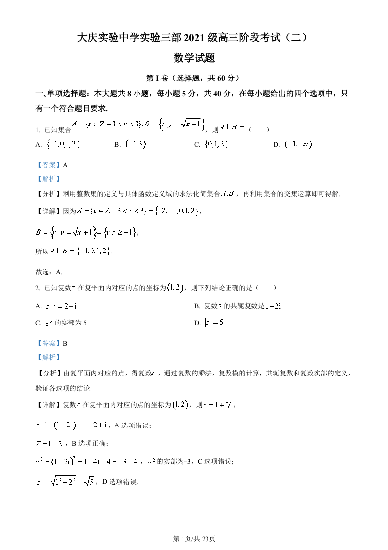 黑龙江省大庆市实验中学实验三部2024届高三上学期阶段考试(二)数学(精品解析版)