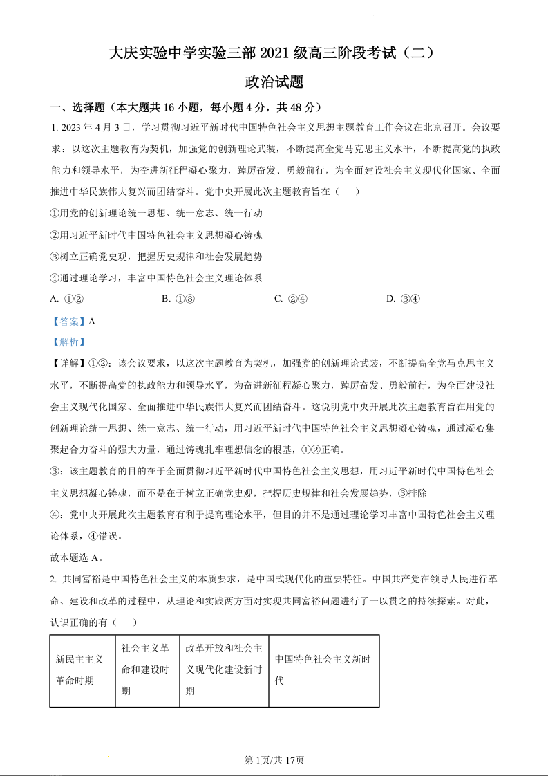 黑龙江省大庆市实验中学实验三部2024届高三上学期阶段考试(二)政治(精品解析版)