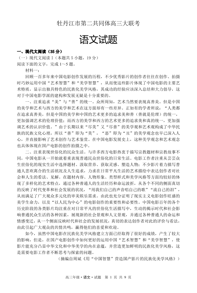 黑龙江省牡丹江市普通高中第二共同体2024届高三上学期期末联考语文+答案