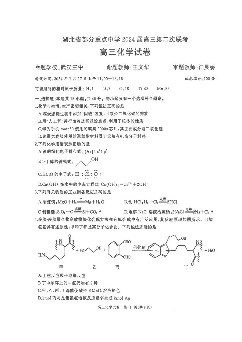 湖北省部分重点中学2024届高三上学期第二次联考化学