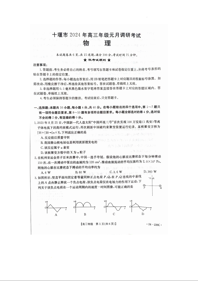 湖北省十堰市2024届高三上学期1月调研考试物理
