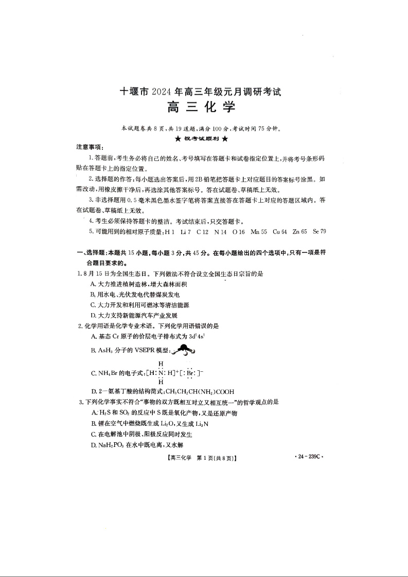 湖北省十堰市2024届高三上学期1月调研考试化学
