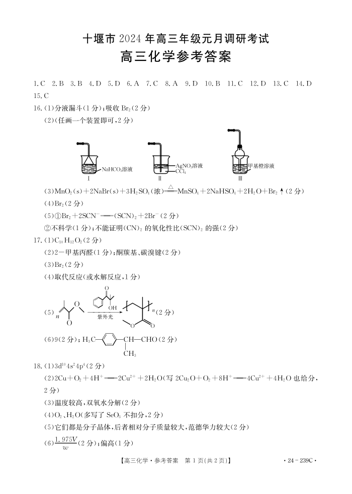 湖北省十堰市2024届高三上学期1月调研考试化学答案