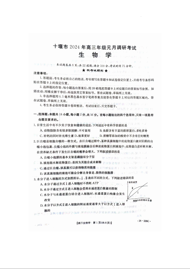 湖北省十堰市2024届高三上学期1月调研考试生物