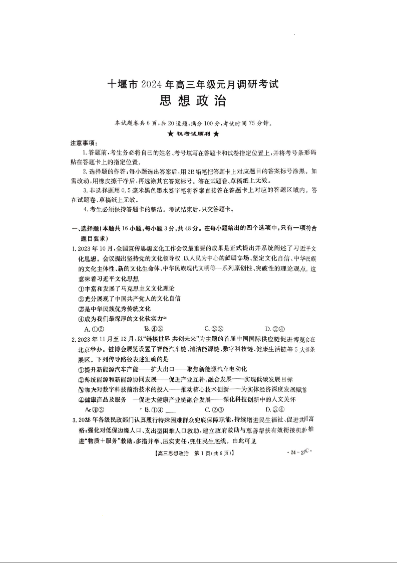 湖北省十堰市2024届高三上学期1月调研考试政治