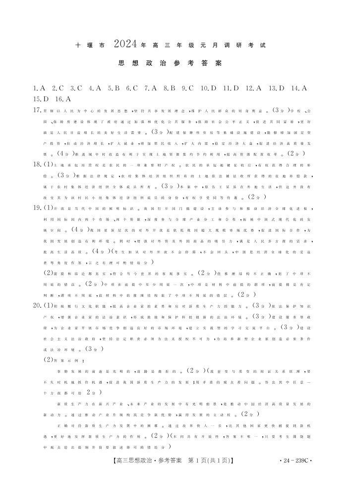 湖北省十堰市2024届高三上学期1月调研考试政治答案