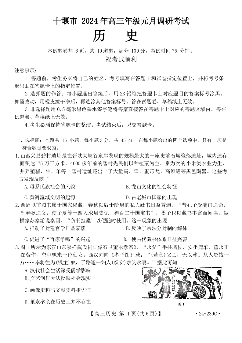 湖北省十堰市2024届高三上学期1月调研考试历史