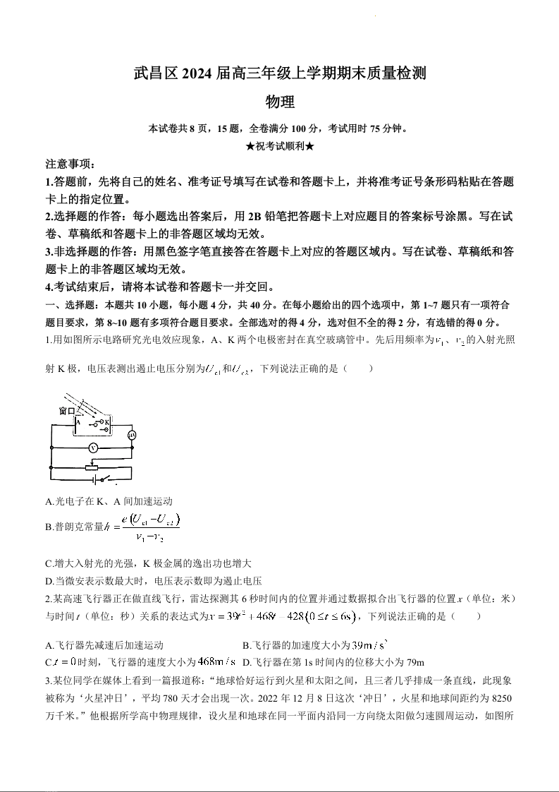 湖北省武汉市武昌区2024届高三上学期期末质量检测试题物理+答案