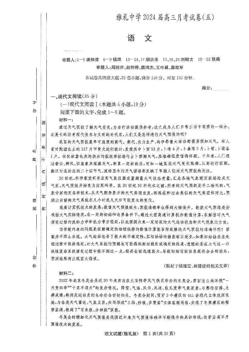 湖南省长沙市雅礼中学2024届高三上学期月考(五)语文+答案