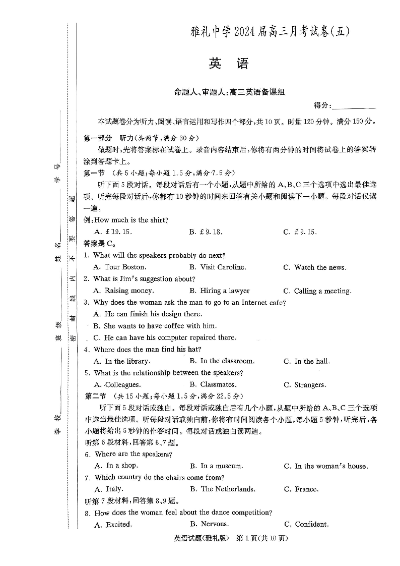 湖南省长沙市雅礼中学2024届高三上学期月考(五)英语+答案