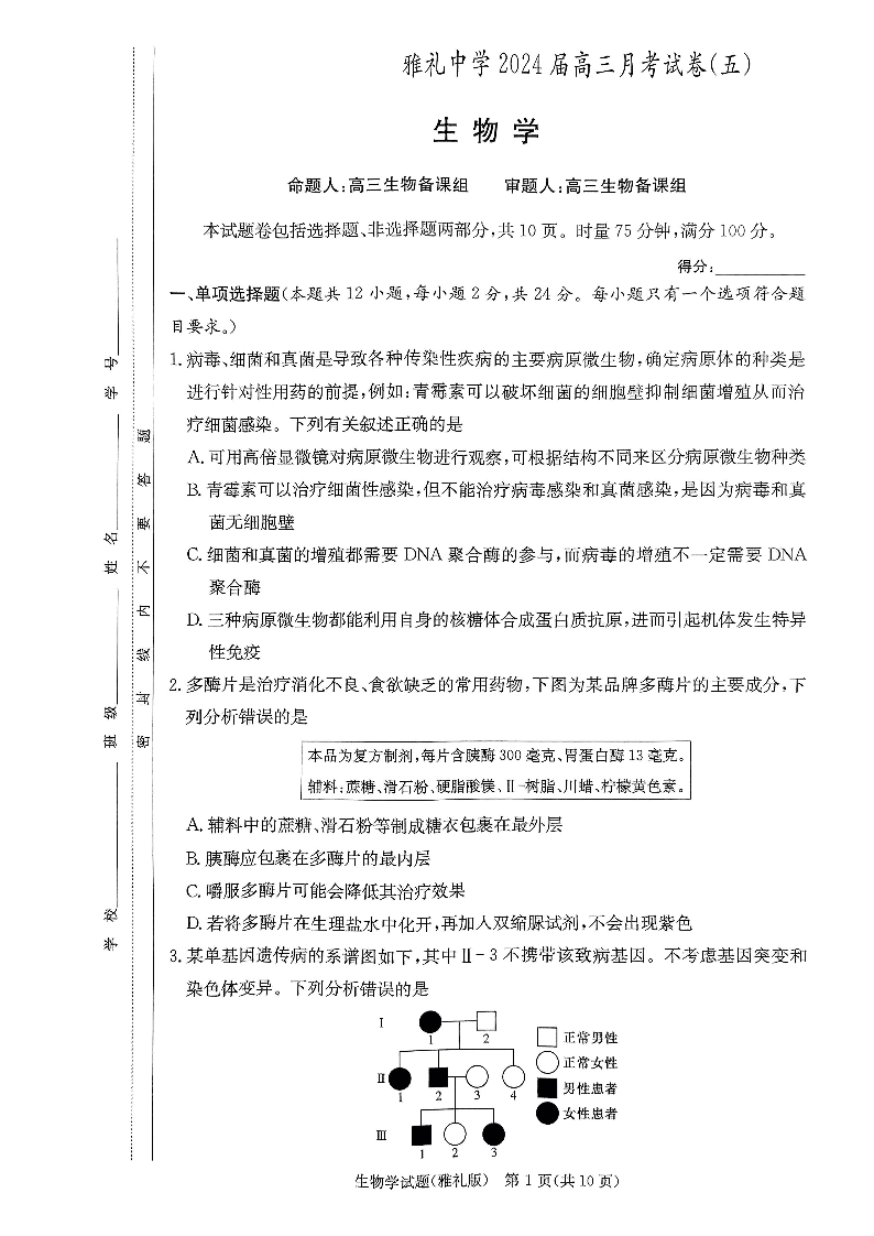 湖南省长沙市雅礼中学2024届高三上学期月考(五)生物+答案