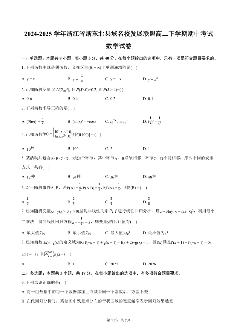 浙江省ZDB名校发展联盟2024-2025学年下学期4月高二期中考试数学+答案