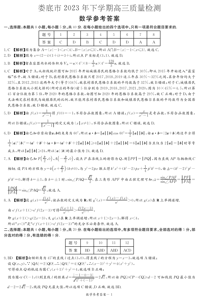湖南省娄底市2024届高三上学期期末考试数学答案