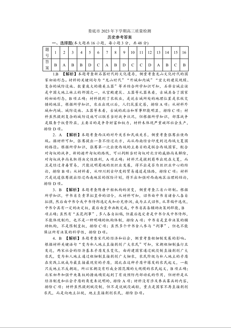 湖南省娄底市2024届高三上学期期末考试历史答案
