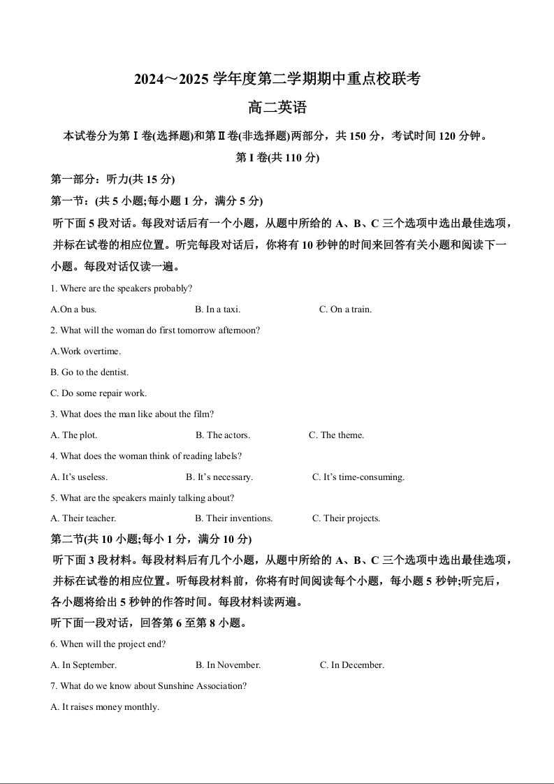 天津市五区县重点校联考2024-2025学年下学期4月高二期中考试英语+答案