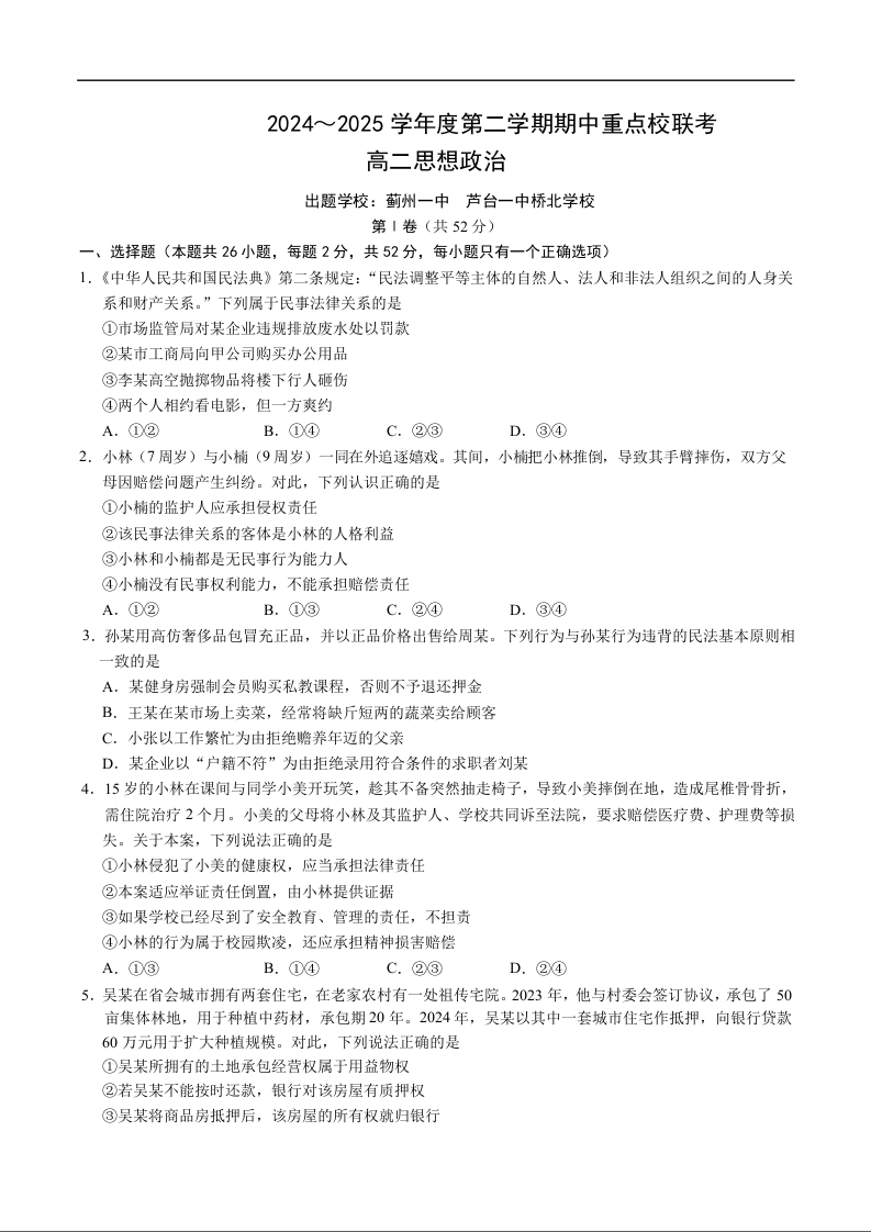 天津市五区县重点校联考2024-2025学年下学期4月高二期中考试政治+答案