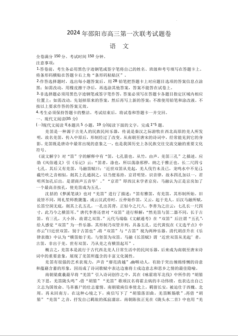 湖南省邵阳市2024届高三第一次联考(邵阳一模)语文