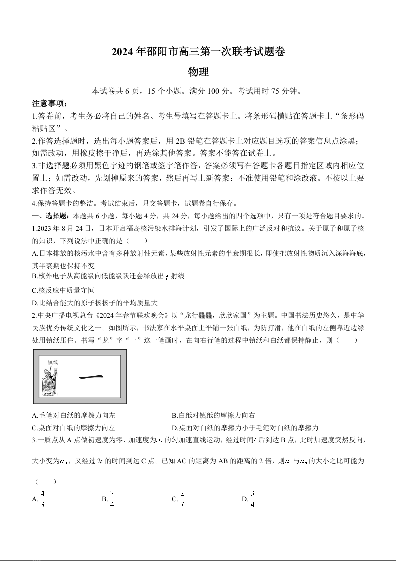 湖南省邵阳市2024届高三第一次联考(邵阳一模)物理+答案