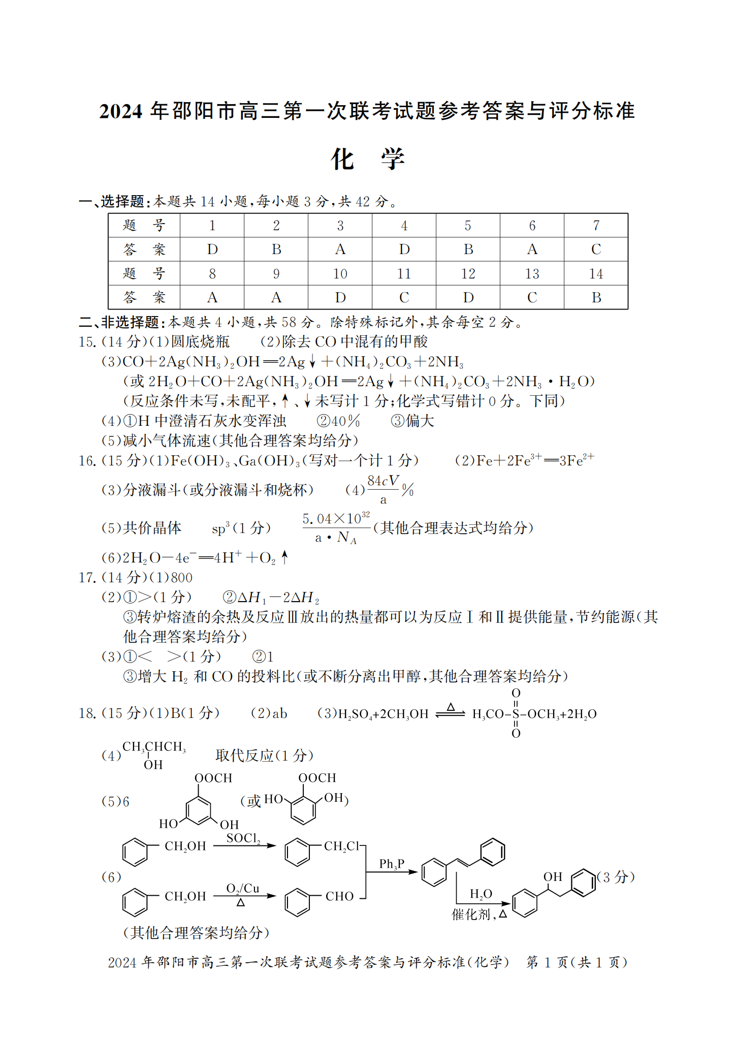 湖南省邵阳市2024届高三第一次联考(邵阳一模)化学答案