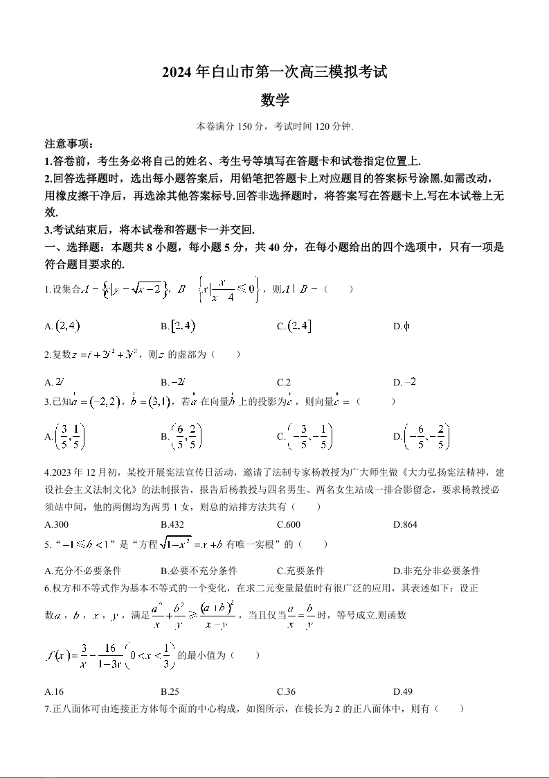 吉林省白山市2024届高三第一次模拟考试数学+答案