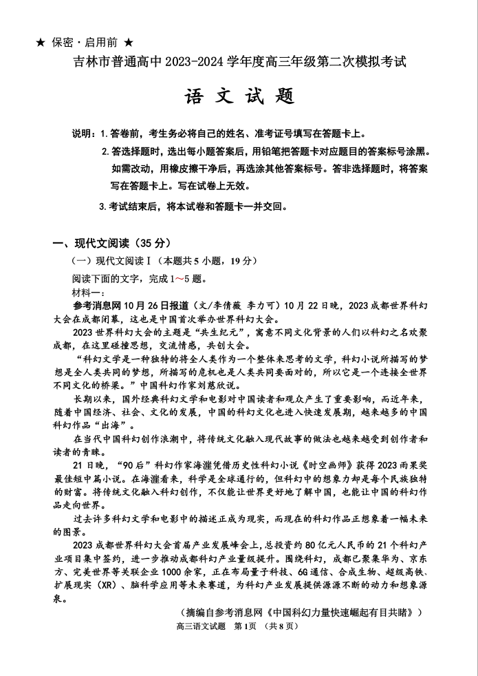 吉林省吉林市2024届高三上学期第二次模拟考试语文